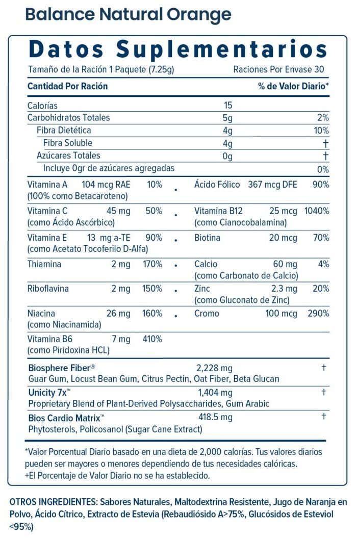 Unicity Balance Natural Orange es una bebida antes de las comidas con una matriz de fibra patentada que incluye compuestos vegetales bioactivos, polisacáridos y micronutrientes. La matriz de fibra está diseñada para ayudar a reducir el impacto que los carbohidratos y el colesterol en exceso pueden tener en el cuerpo. Balance Natural Orange también está formulado para proporcionar vitaminas, minerales y fibras solubles esenciales para ayudar a controlar el apetito, y no contiene sabores ni edulcorantes artificiales.